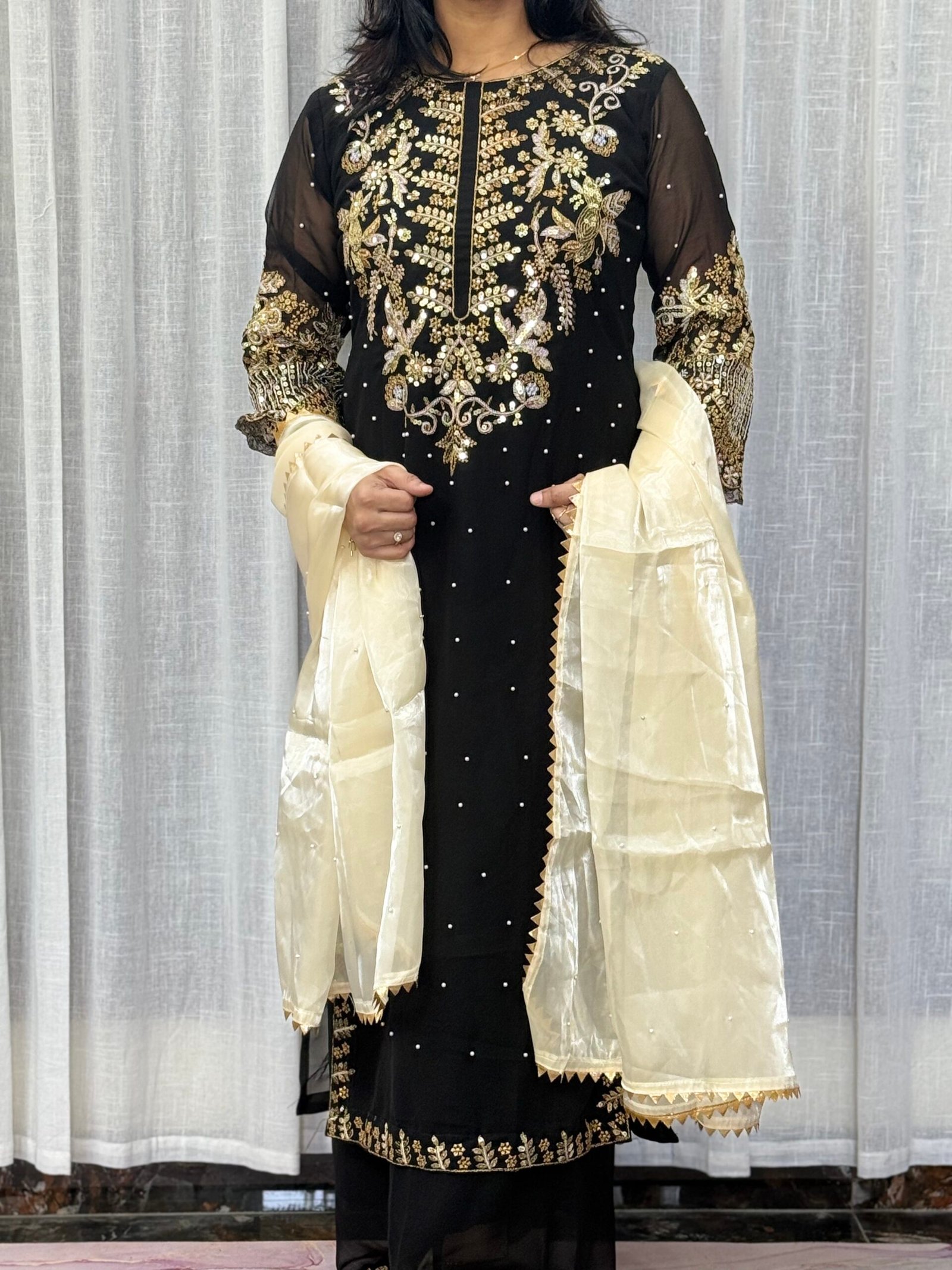 Stunning black georgette kurti and palazzo set with full lining, intricate sequin and pearl work, and a contrast dupatta. Elegant festive and party wear for women.