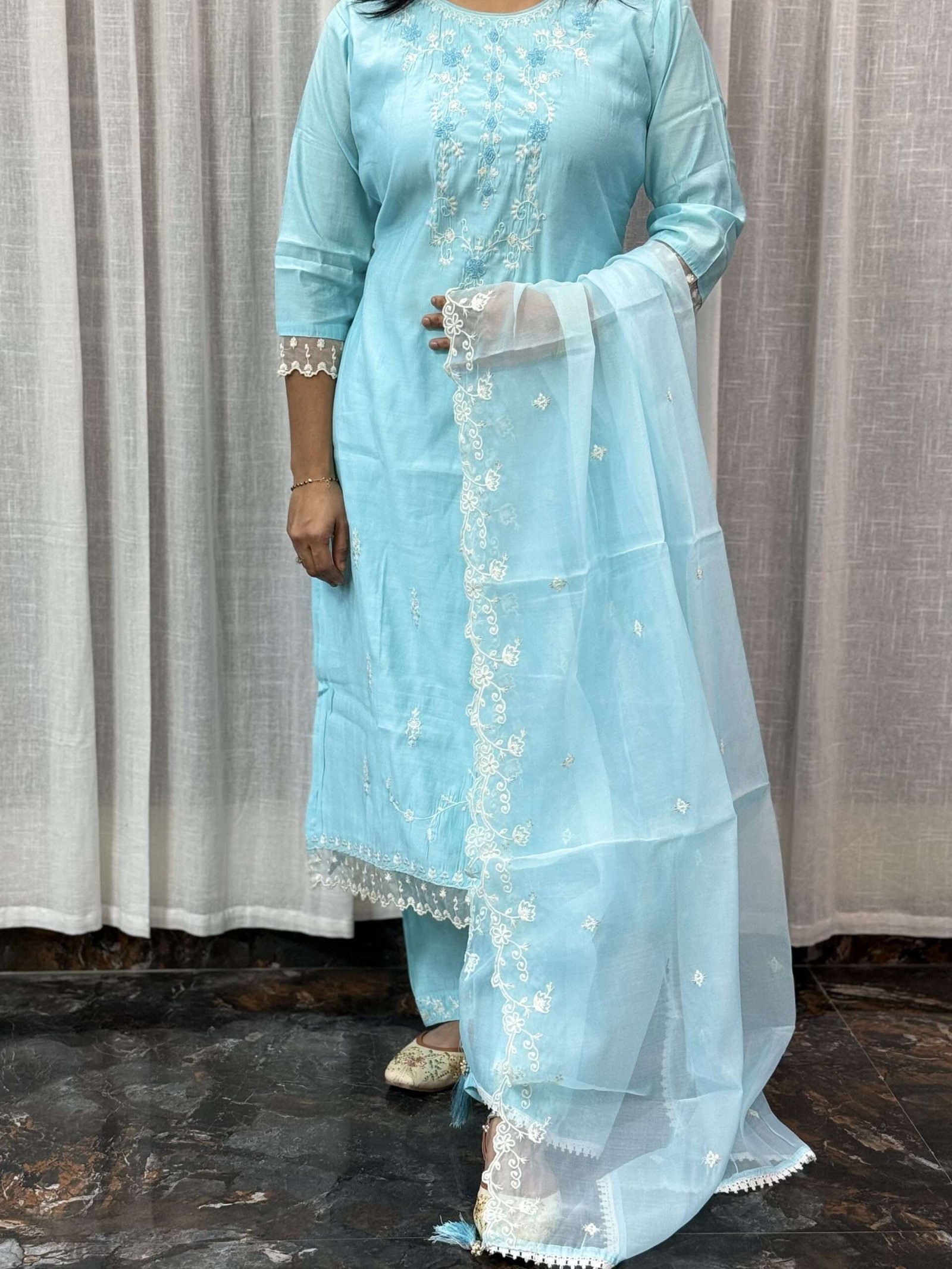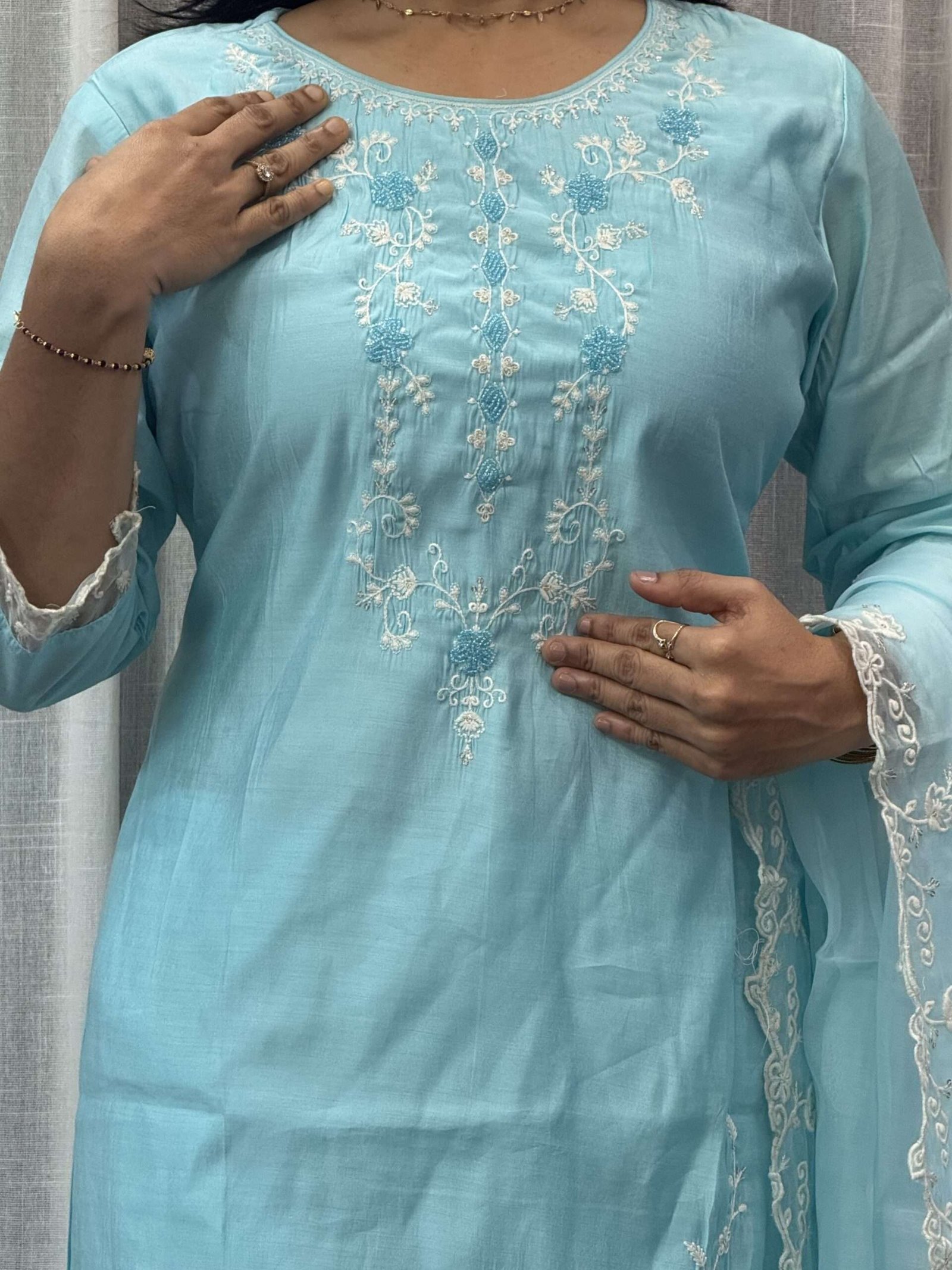 Viscose silk kurti set with maggam neck work, kurti lining only, and 2.3m organza dupatta.