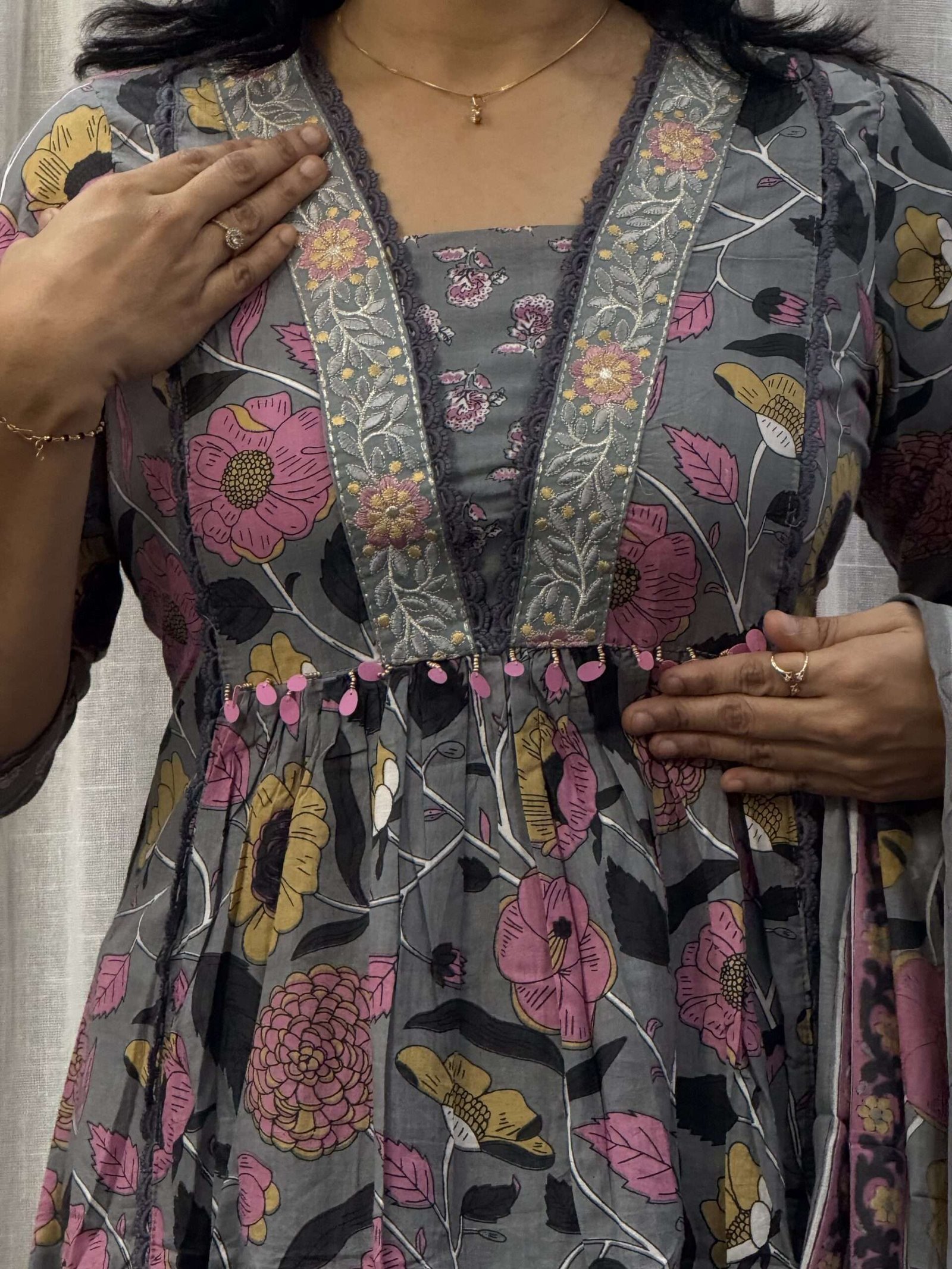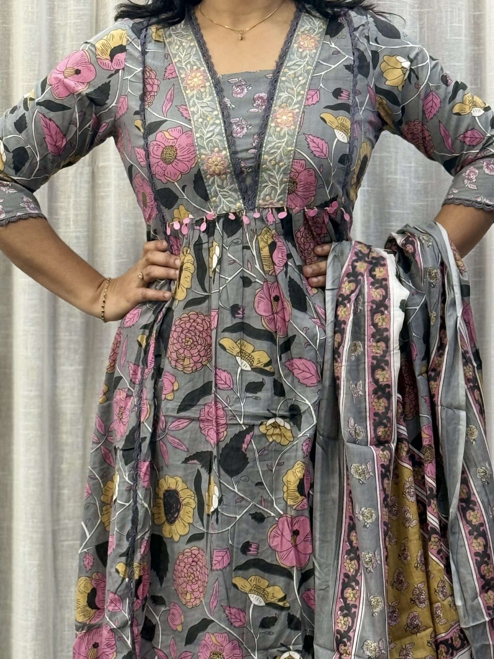 Pure cotton frock-style kurti set with embroidery and 2.3m dupatta.