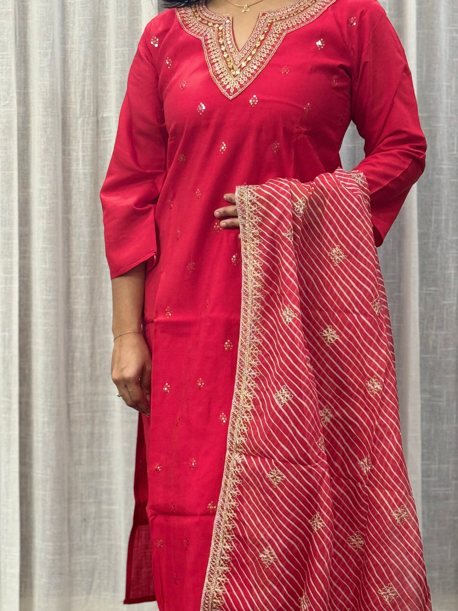 Red Roman silk dress with sequin work, full lining, and dupatta with golden border and cross-line design — perfect for weddings and festive occasions.