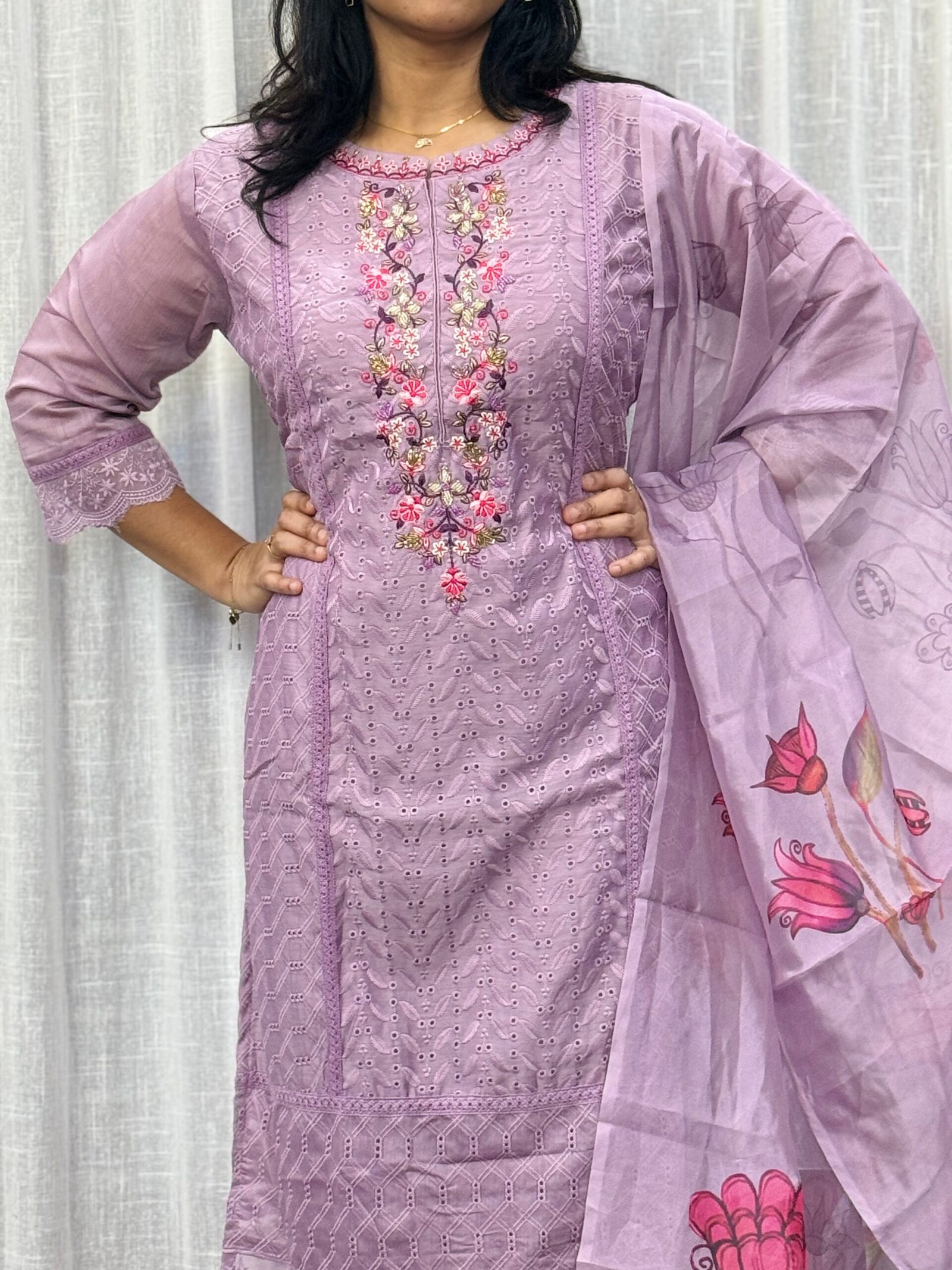 Lavender Hakoba Cotton 3 Pc Set with Cut Beads, Thread Work & Organza Digital Print Dupatta | 3S24072513