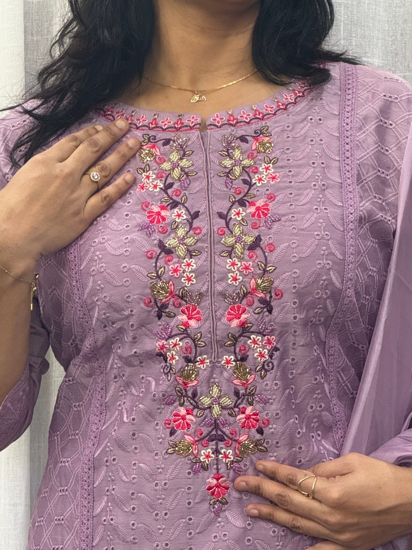 Elegant lavender Hakoba cotton 3 pc set with cotton lining, featuring cut bead and thread embroidery, closed neck design, and soft organza digital print dupatta — perfect for office and festive wear.