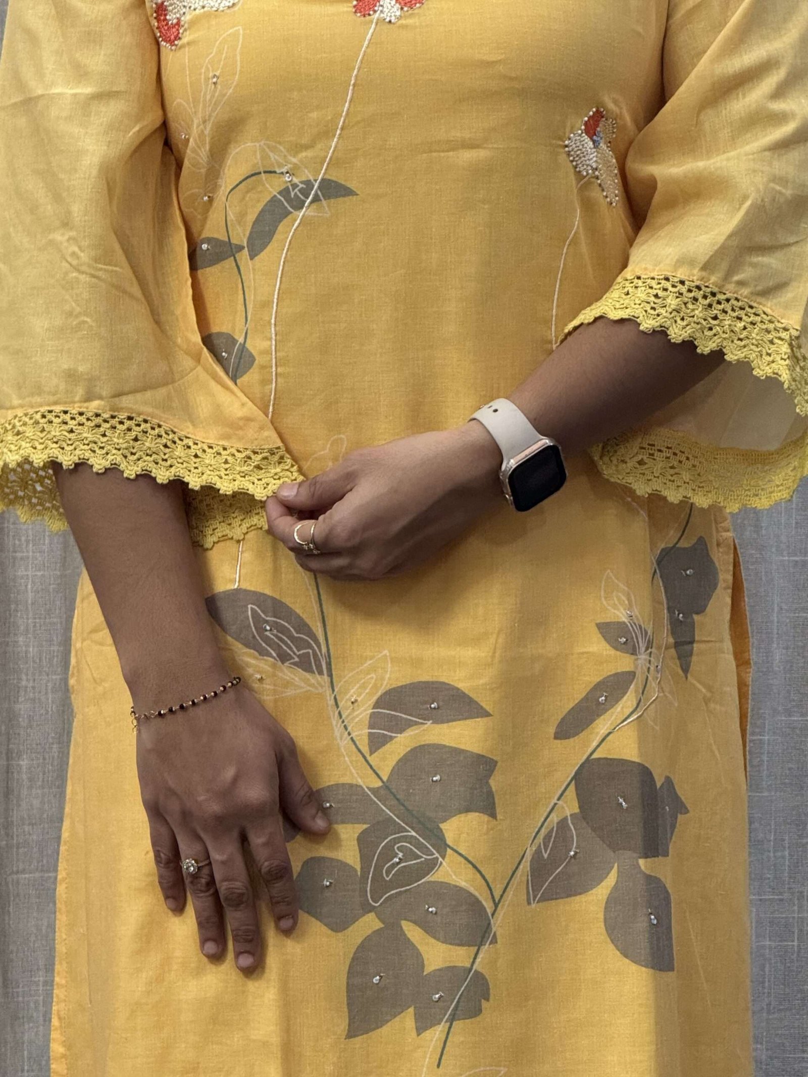 Yellow mul cotton co-ord set with lining and classy pearl bunch detailing.