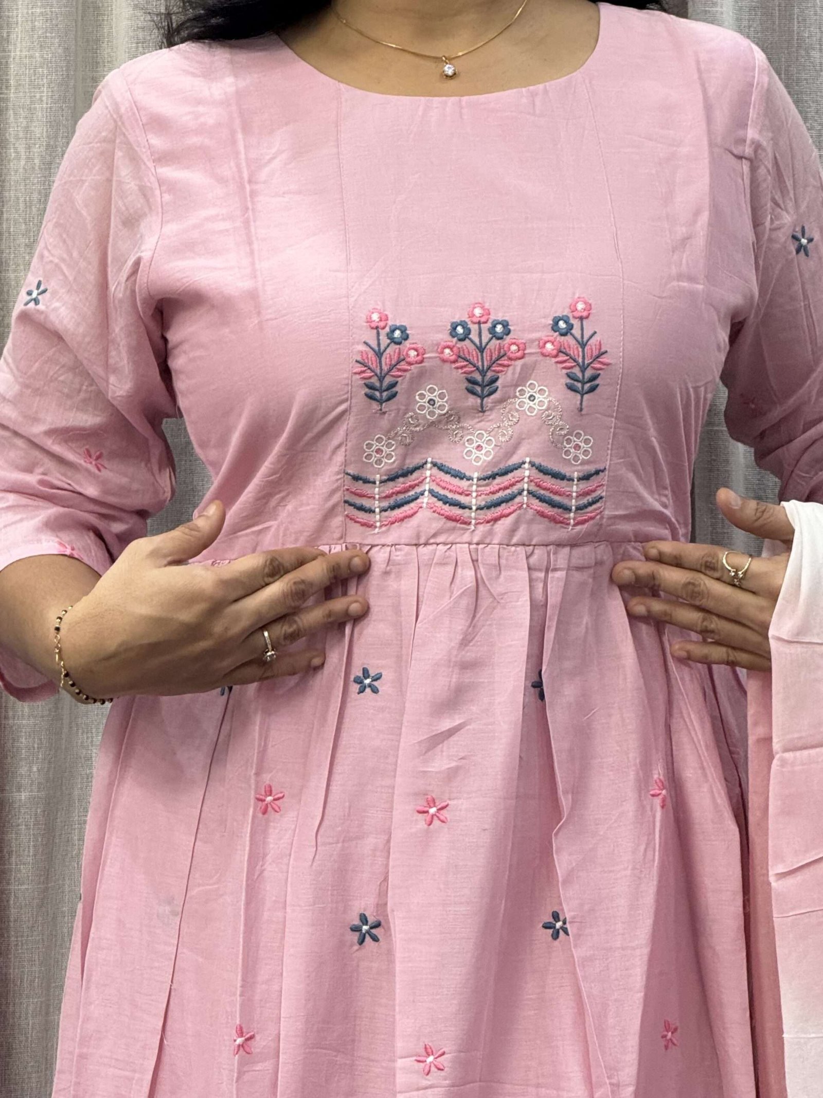 Mul cotton frock-style kurti set with embroidery, cut work, lining, and lace-edged 2.25m dupatta.
