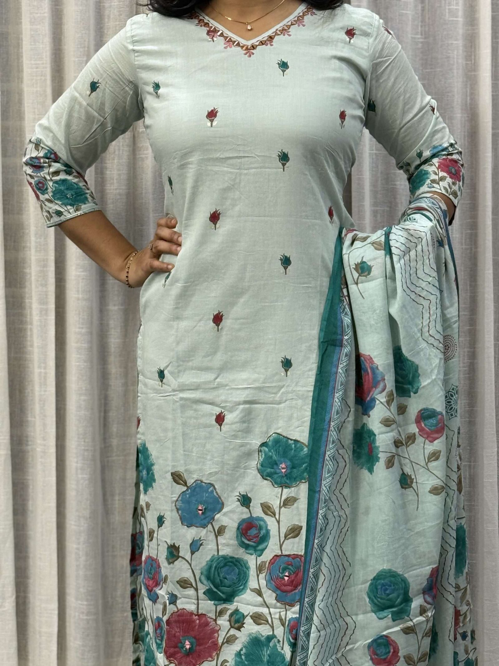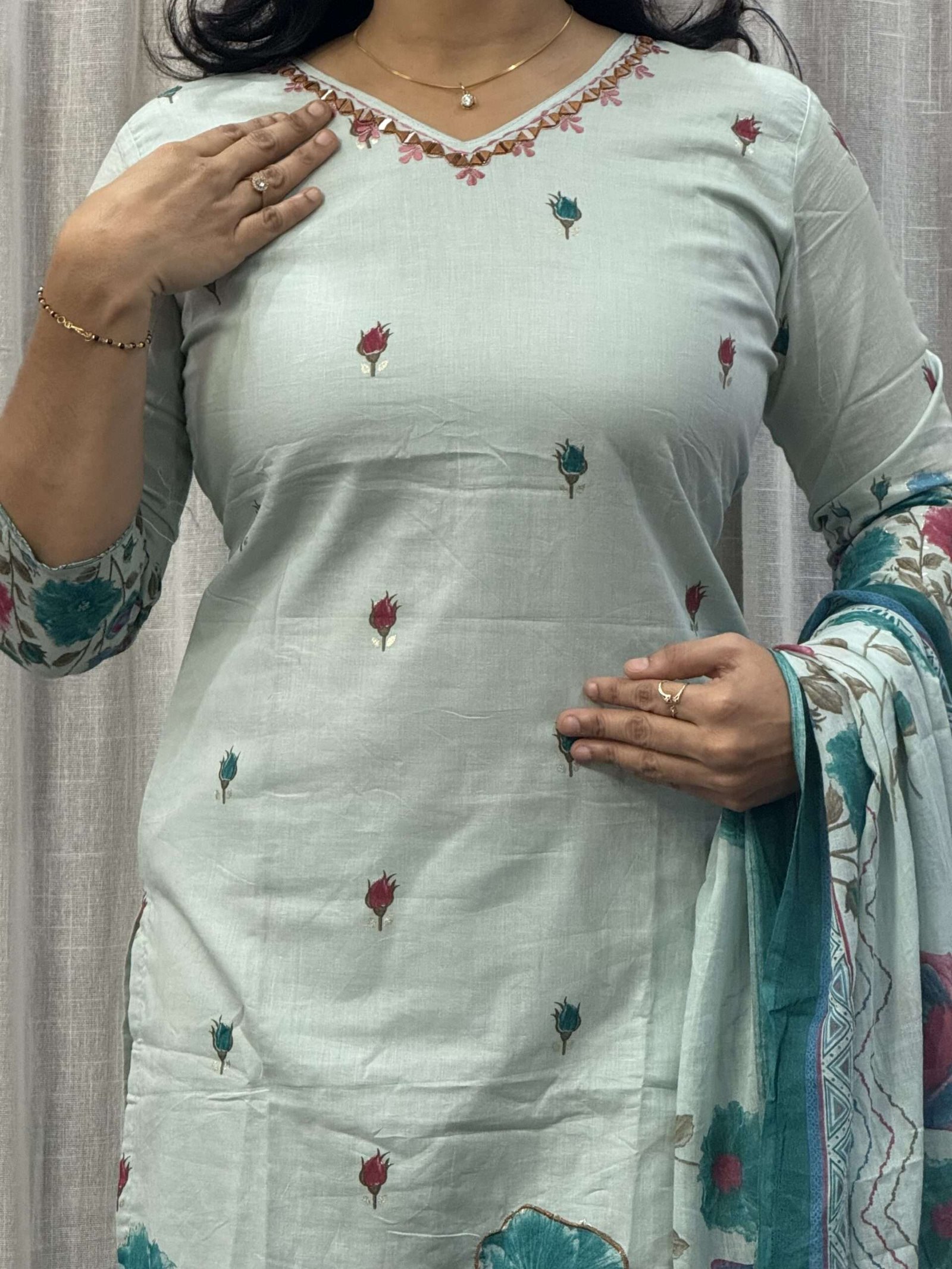Pure cotton kurti set with mirror, embroidery, digital print, cotton lining, and 2.15m dupatta.