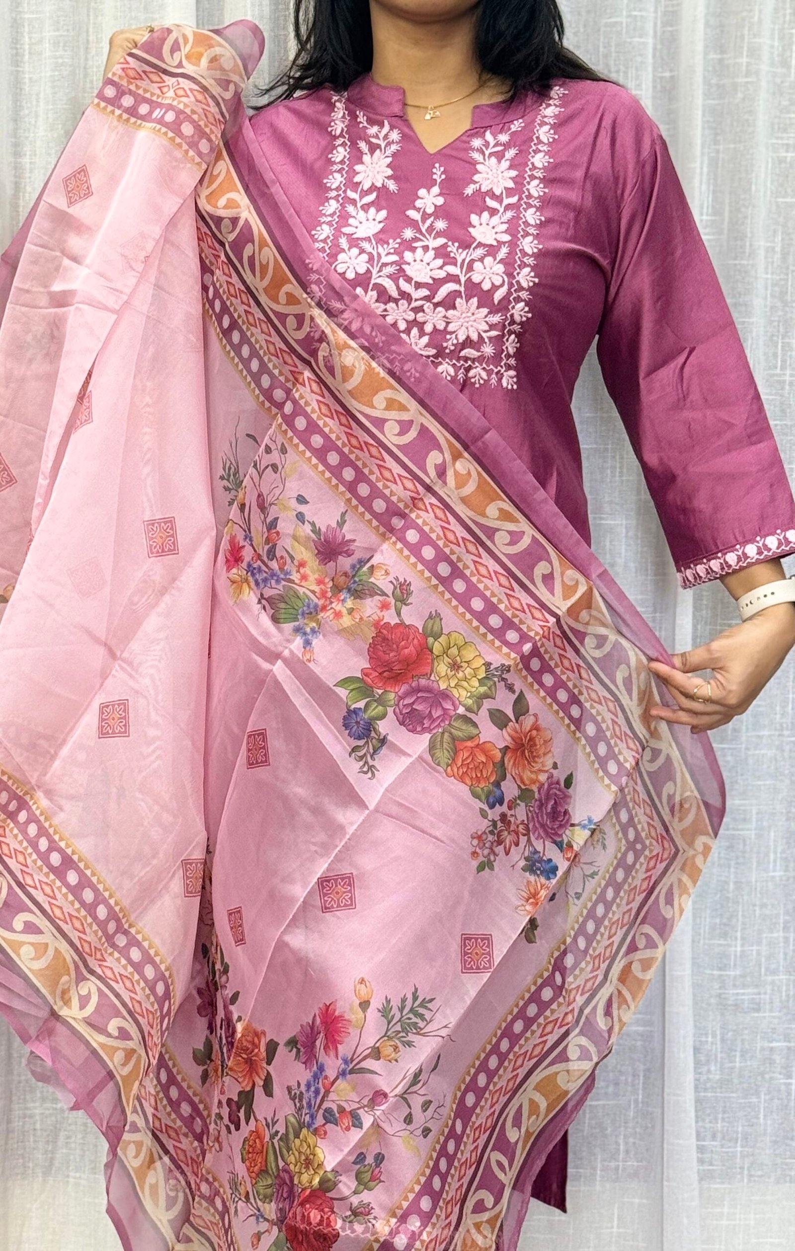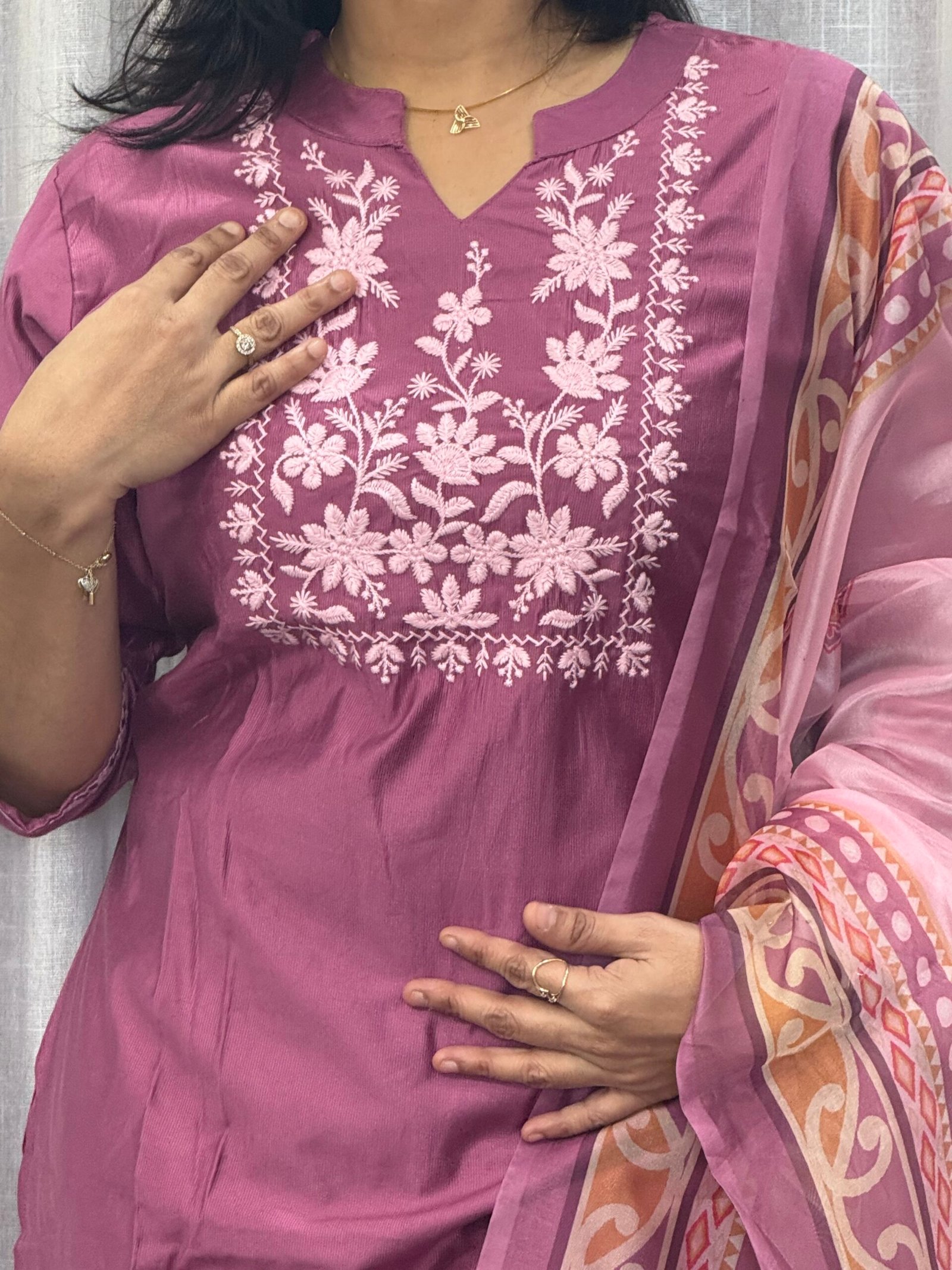 Elegant viscose silk 3 pc set thread neck work, and crepe silk floral dupatta. Ultra-comfortable for all-day wear with a premium, classy finish.