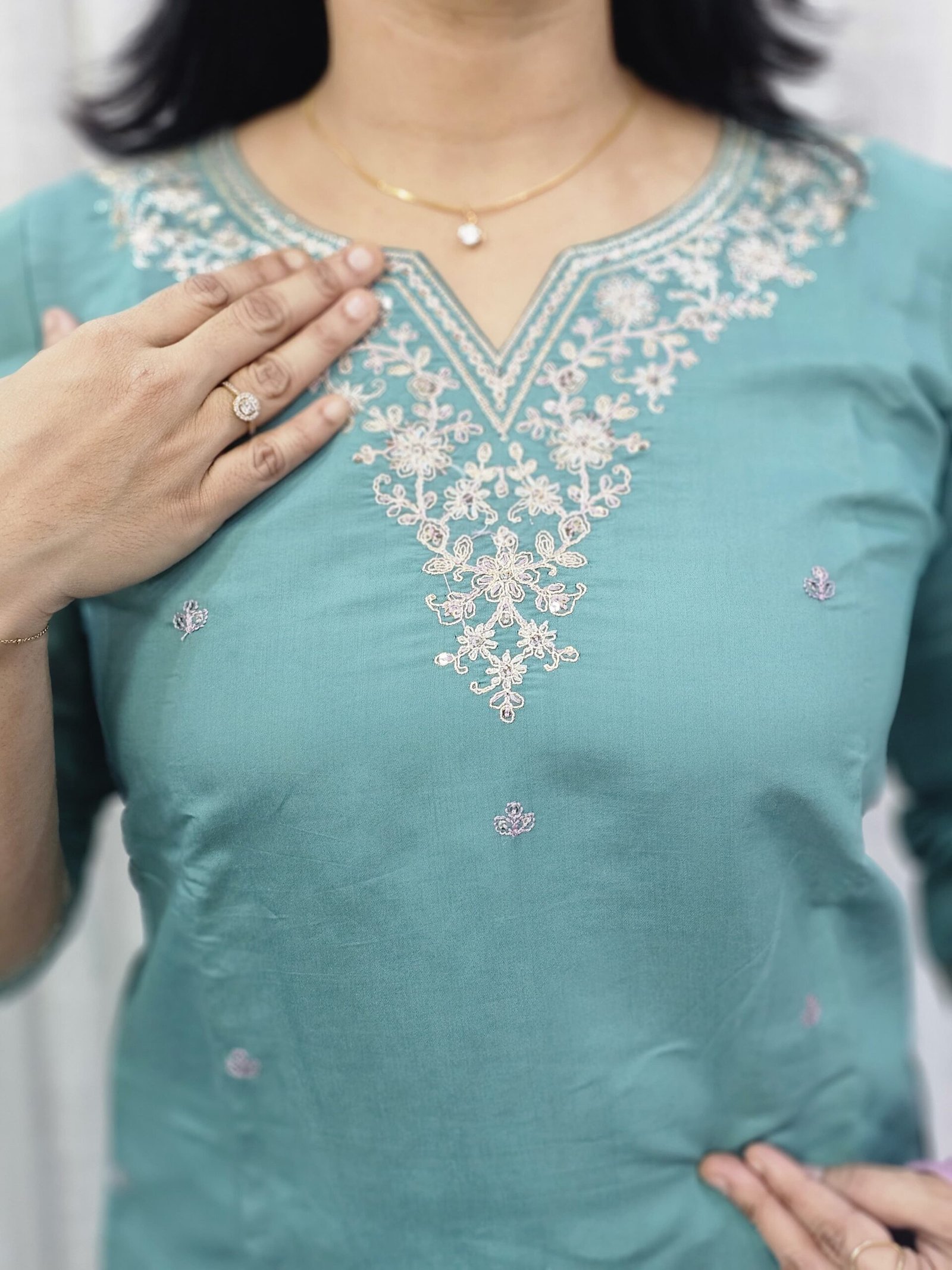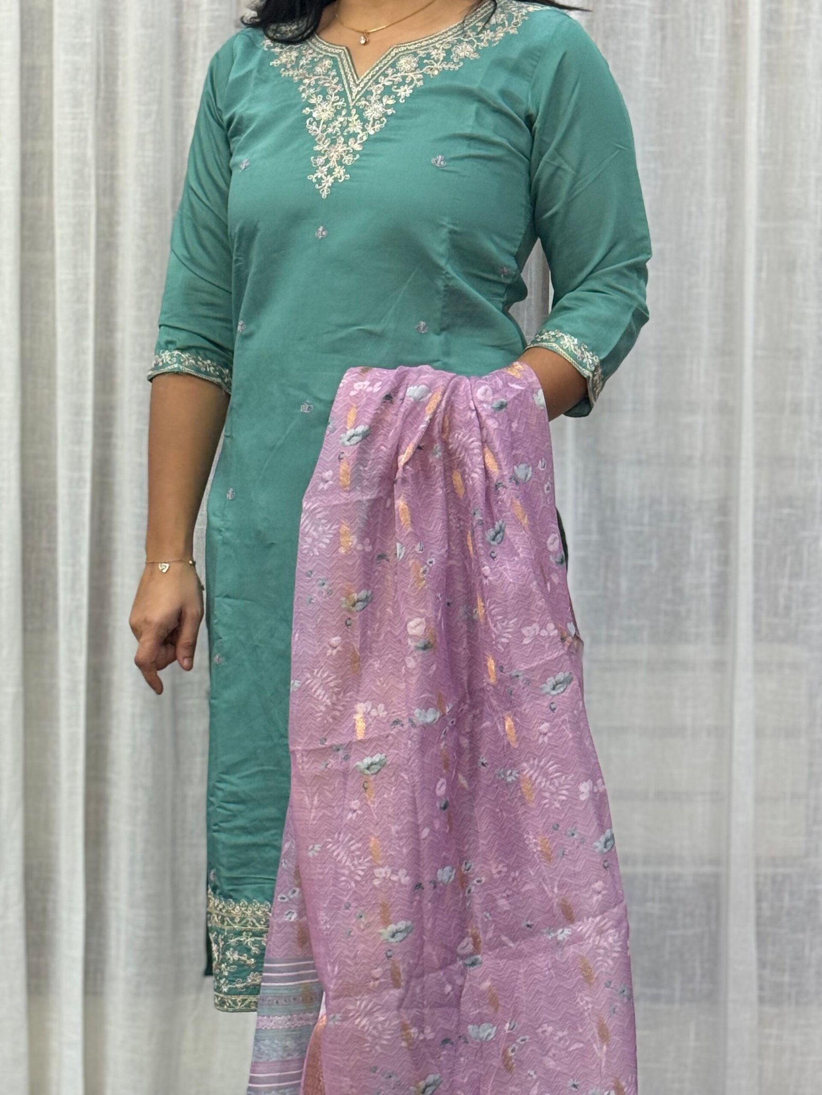 Roman silk salwar set with full-length kurti lining and elegant contrast dupatta for a refined festive look.