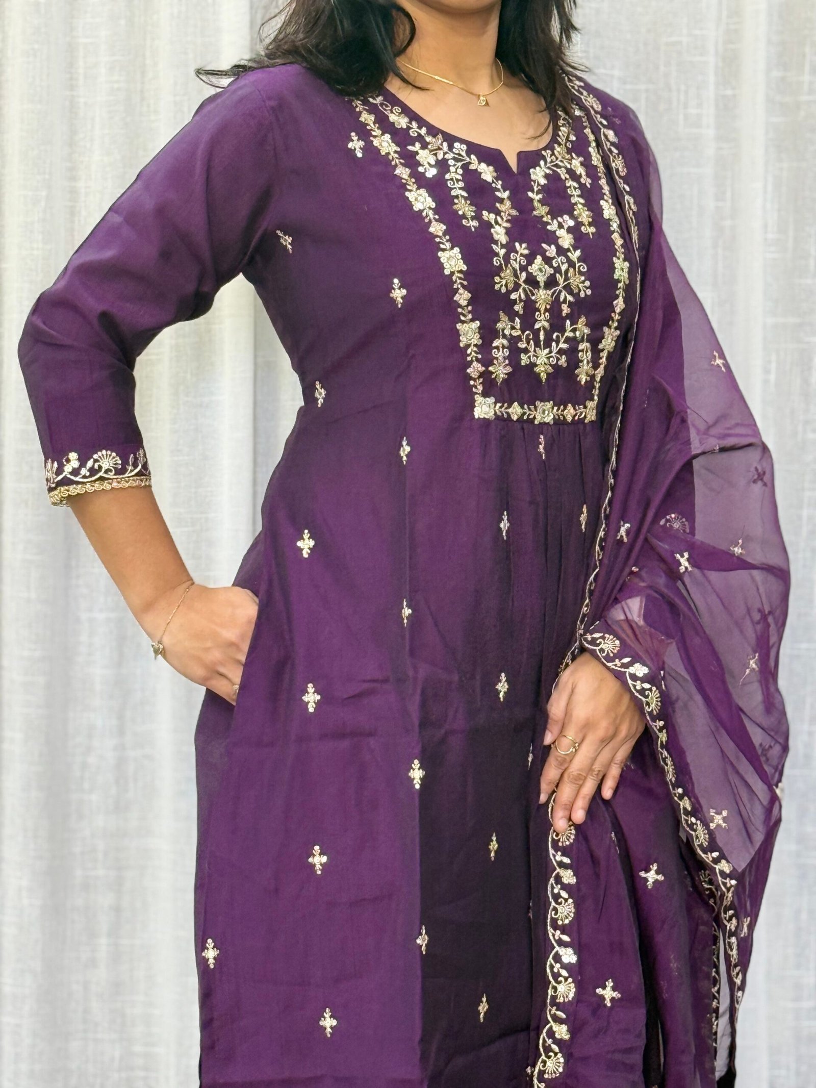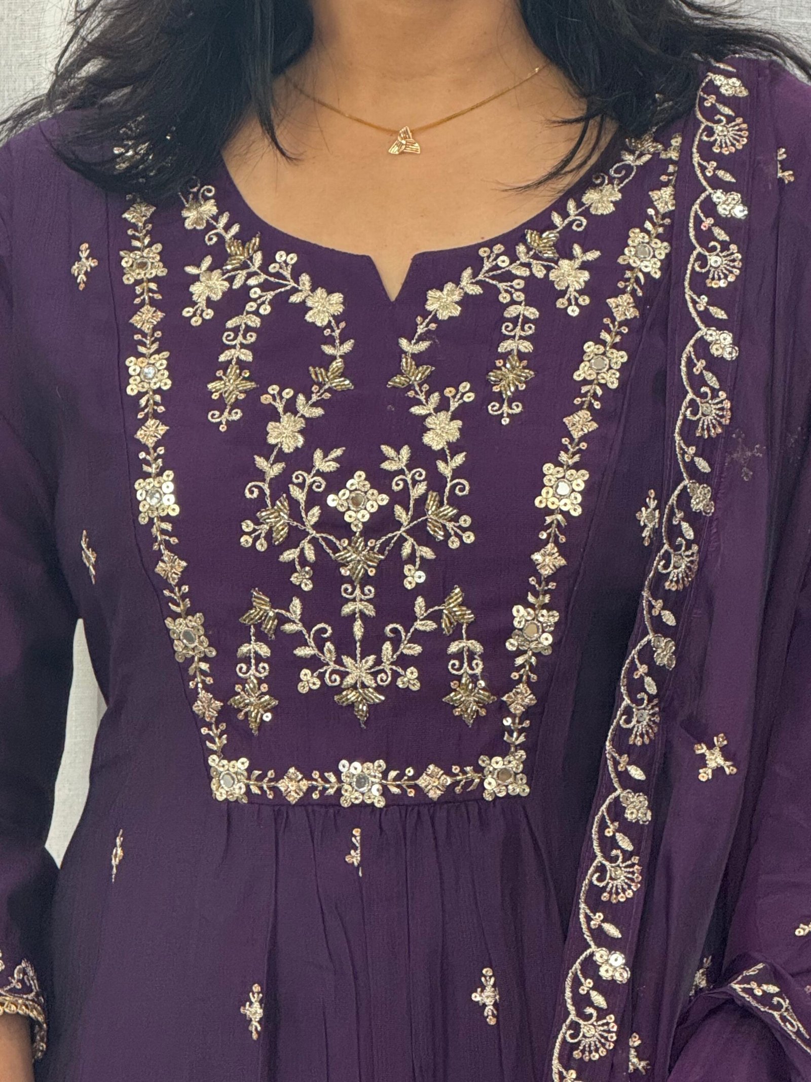 Rich and royal Vatican fabric 3 pc Nyra cut set with intricate thread, mirror, and cut dana work. Features a soft organza dupatta (2.3m) and side pocket — elegant comfort with zero transparency.