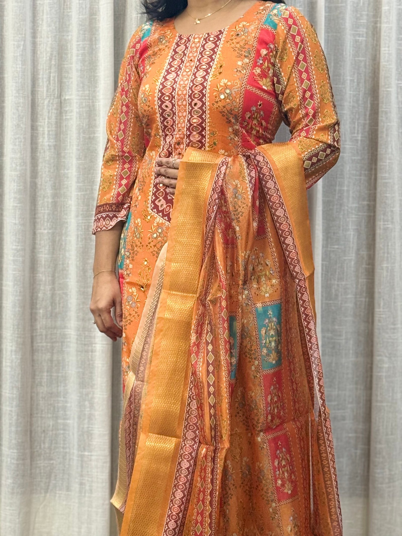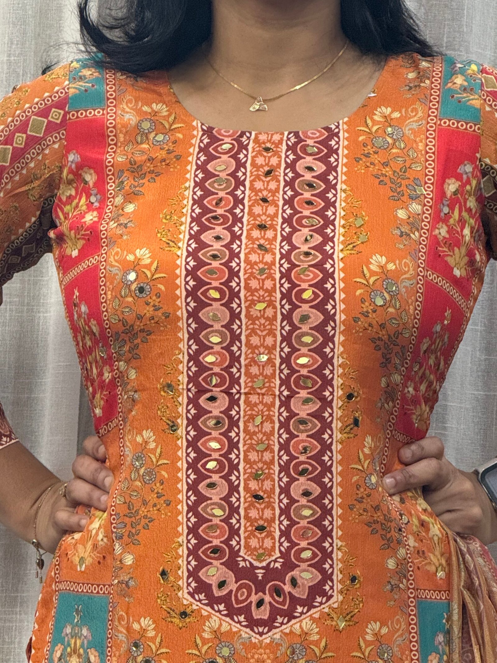 Dry clean only to maintain fabric finish and mirror work integrity