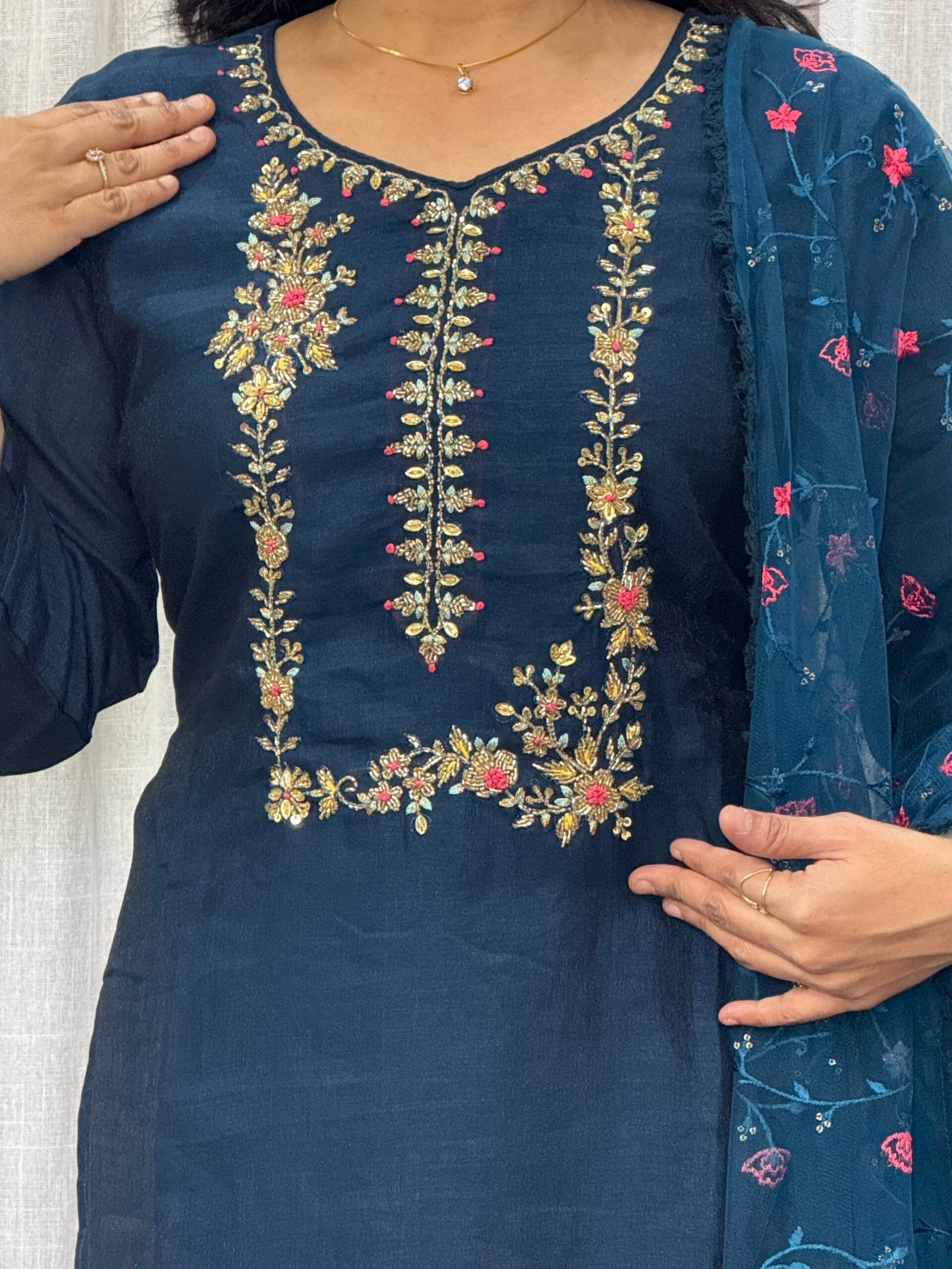 Premium vichitra silk salwar set with maggam neck, full lining & net dupatta with thread work.