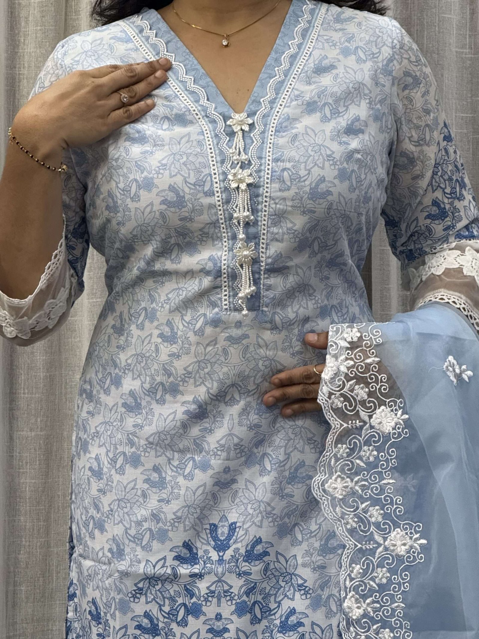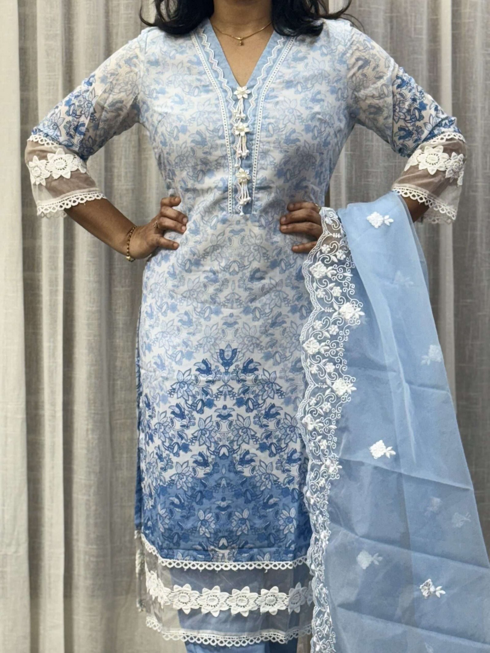 Viscose silk kurti set with lace, pearl work, mul cotton lining, and organza dupatta with cut work.