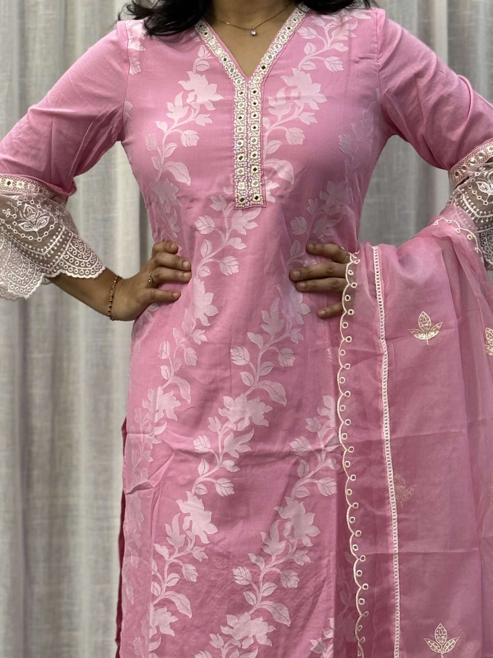 Premium viscose silk kurti set with jamdhani weave, lining, and organza dupatta with cut work.